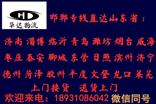 邯郸到威海物流公司运费查询:18931086042华达物流以一流的服务体系,本着安全,准时,互友,互惠的原则赢得市场,只要一个电话,一切由我公司操办, 望广大新老客户给予大力支持、与我公司联络,我们将竭诚为您提供一切方便,欢迎来人来电咨询!